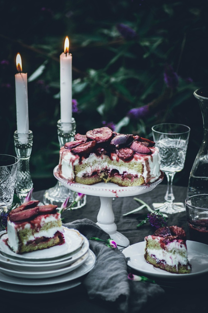 MANDLOVÝ KOLÁČ S TVAROHOVÝM KRÉMEM A KARAMELIZOVANÝMI ŠVESTKAMI