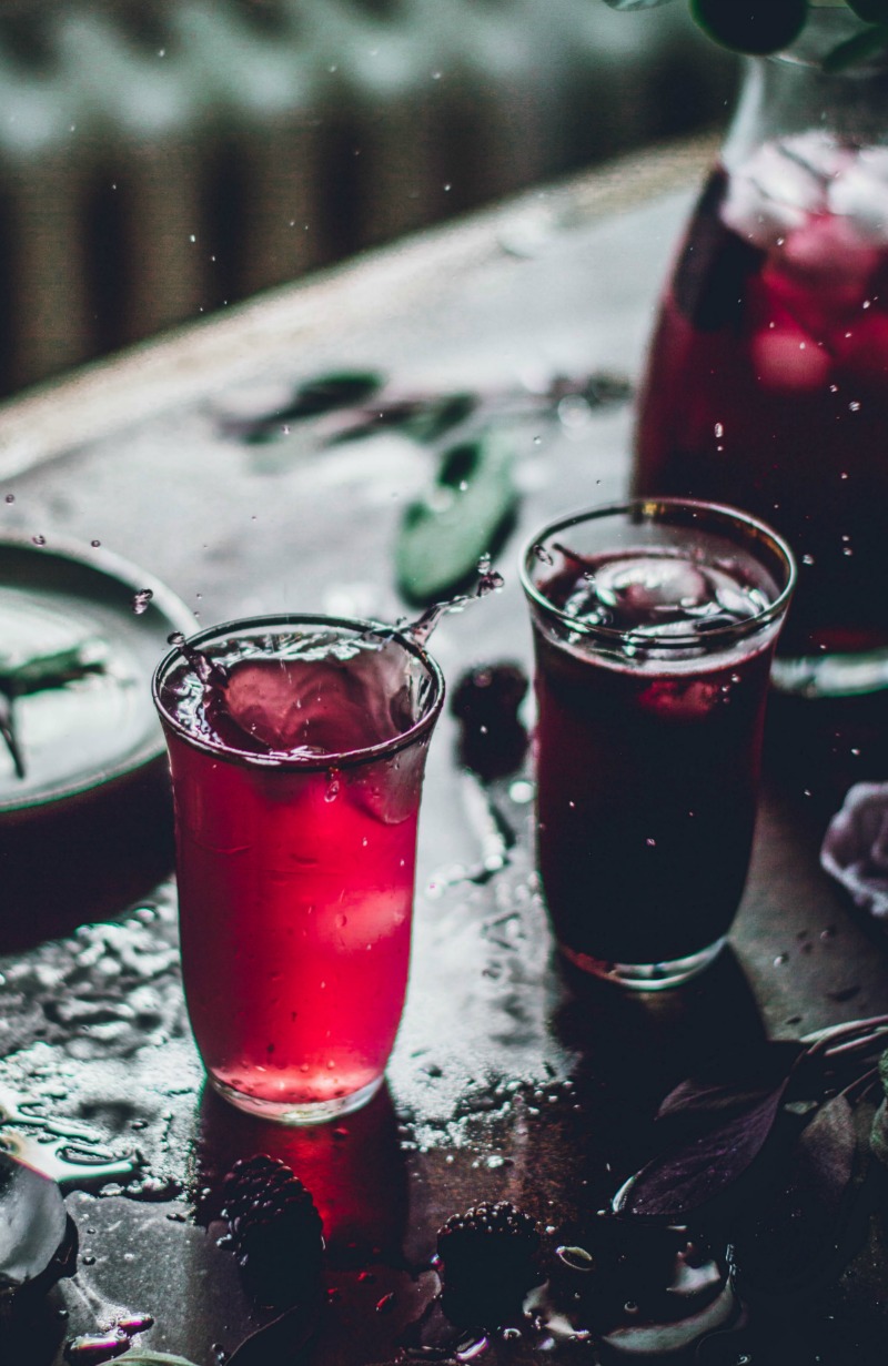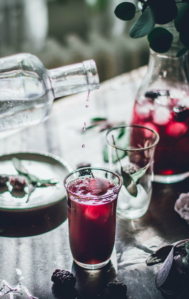 Do skleniček si rozdělíme kostky ledu, pár snítek šalvěje a ostružiny. Nalijeme sirup a zalijeme perlivou vodou.